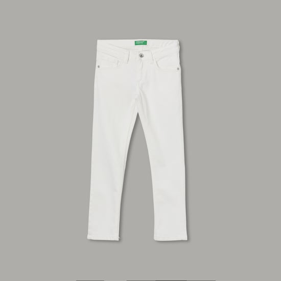 United Colors of Benetton Girls Solid Slim Fit Jeans (White) — Clean, white slim-fit jeans for boys with a mid-rise, 5-pocket design, cotton-blend comfort and button-zip closure — a versatile casual essential.