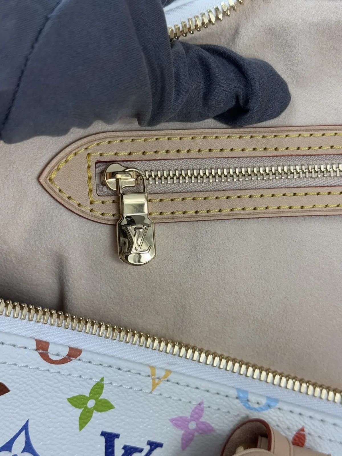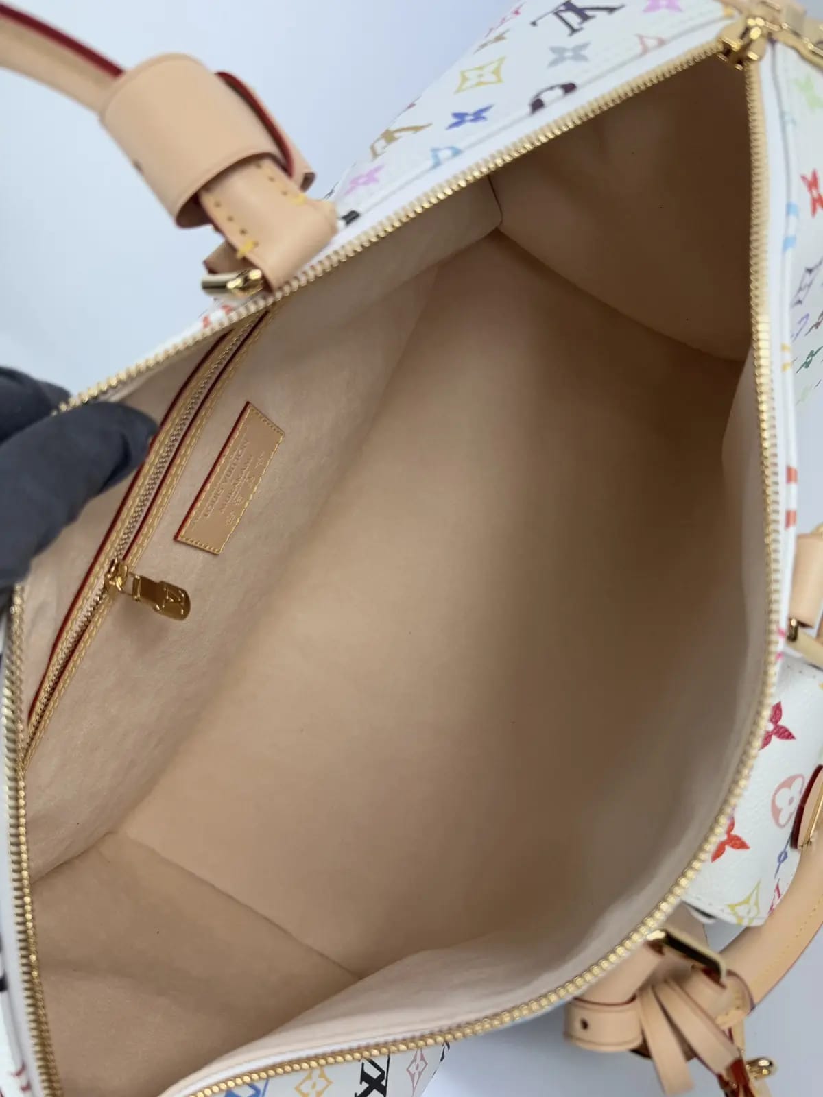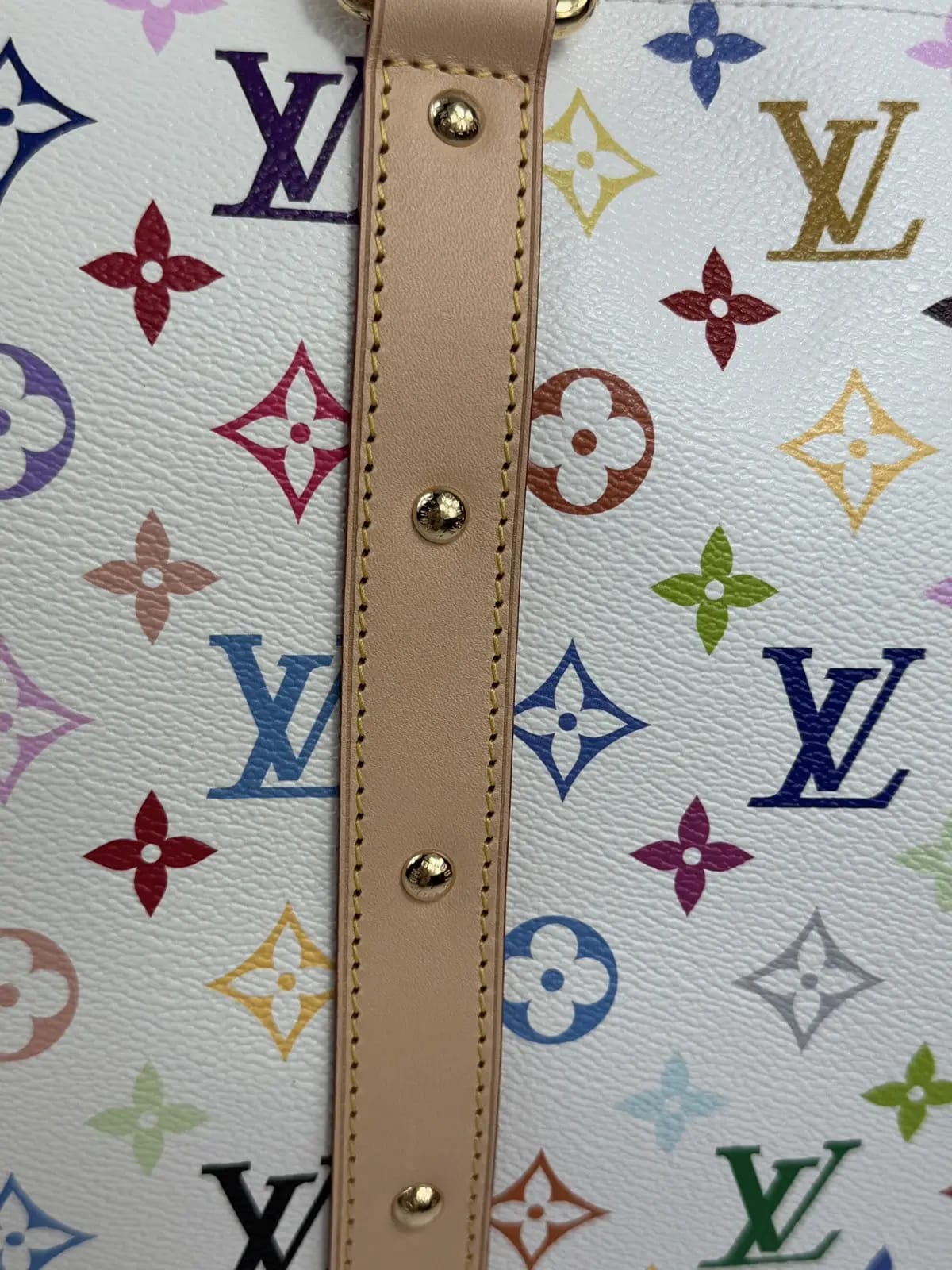 Durable coated canvas exterior featuring a vibrant multicolor monogram print